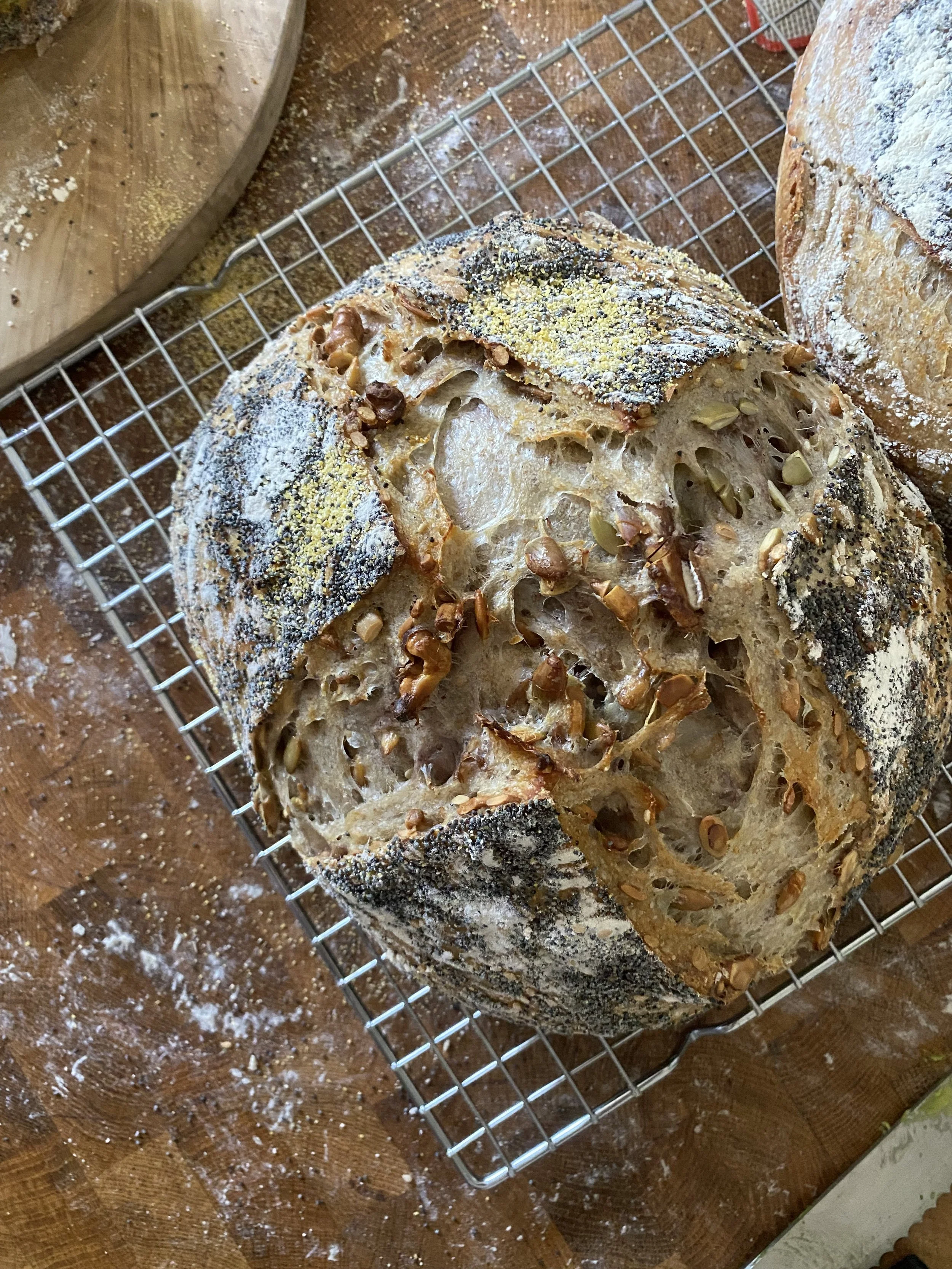 To create a perfect seed loaf mix in nuts and seeds to first stage if our dough loaf making, after initially adding flour to the water and starter mixture.